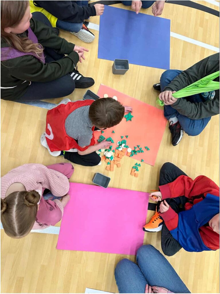 The fifth station was unplugged, meaning it did not have electronic devices, but promoted more hands-on learning. In this station, students were divided into groups A, B, and C, and each was given separate tasks. Student A had to draw a picture on a whiteboard to give to student B (we gave out sample photos, and they either drew a Cat, a car, or a house). Once student B received the drawing, they had to pick out 3-4 shapes to try and make that drawing (we gave them circles, triangles, and squares). Once student B finished creating their shape, they brought it to student C, who could verify if they used the correct shapes to create that specific design; to build the cat, they needed a circle and two triangles, for example. If that group successfully made the right shape, they got part of a code, and could start again, making the other two shapes to get the full code. The code word changed for each group, and grades 5/6 had the code Innovation, grades 3/4 had the code Computer, and the youngest group’s code was Code.
