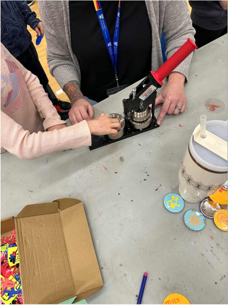 The first station was a button-making station, where each student had the opportunity to customize and create their own buttons. During our previous Tech class, we spent some time creating cutouts they could use in their buttons, and we also provided various markers, colored paper, and Sharpies for them to get creative.